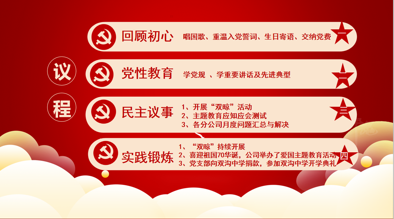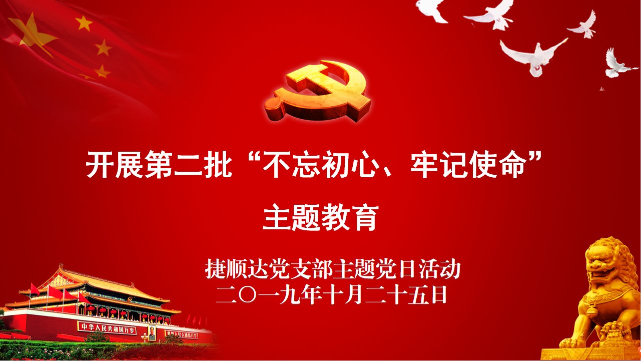 2019年10月25日下午14:30捷順達(dá)黨支部召開(kāi)了本月黨建會(huì):開(kāi)展第二批“不忘初心,牢記使命”主題教育;本次會(huì)議共有4大項(xiàng);1、回顧初心 2、黨性教育 3、民主議事 4、實(shí)踐鍛煉