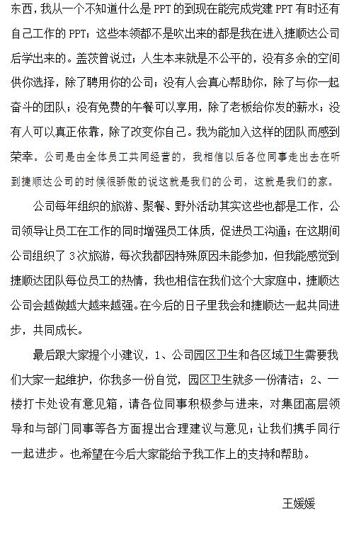 3月19日和3月20日晨會(huì)由三月份工齡增長(zhǎng)的員工物流公司的李珊、售后的李倩倩、投資公司的李華鑫、王媛媛、事業(yè)部李曉、宋靜與大家分享入司以來的成長(zhǎng)感悟。經(jīng)過評(píng)審,投資實(shí)業(yè)王媛媛和物流事業(yè)部李曉與大家分享的入司1年的成長(zhǎng)歷程,內(nèi)容全面、觀點(diǎn)新穎,根據(jù)文件規(guī)定對(duì)王媛媛和李曉分別獎(jiǎng)勵(lì)50元,獎(jiǎng)金在2019年3月份工資中發(fā)放。以下是兩位員工的感悟分享: